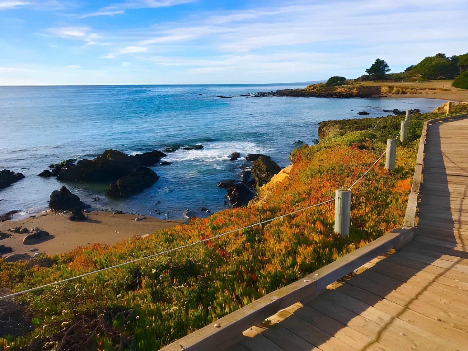 I walk sections of this boardwalk every single Cambria visit, usually in early morning when fog still clings to the water and I have the path mostly to myself. The name comes from the small, translucent white stones that wash up on beaches here—actually not moonstones but a form of quartz worn smooth by waves. Beach access points along the boardwalk allow you to descend to sandy areas for closer examination.